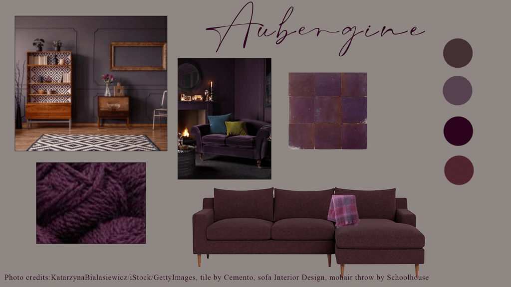 The color aubergine sits in the purple family which is located between warm and cool on the color wheel. Many purple hues have red (warm) undertone which makes the color feel a little more cozy. Colors like aubergine (also known as eggplant) are a great choice to feel cozy because of its warm undertone. It’s also a darker shade that is perceived as a very luxurious and rich color. In 2024/25 deep violets are projected to be a key color according to color agency Coloro. Whether you reach for a muted violet which is a little more subdued or a deep eggplant, purple is a great color to create a cozy vibe.