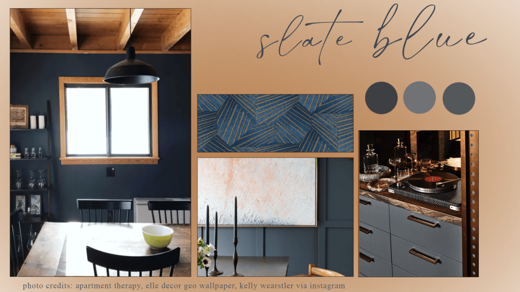 Many believe that blue tones will feel cold. In a small space, a blue tone will actually compliment the natural rustic hard woods and warm tones. Blue will also make a space feel a little larger than it is–so if you want a cozy-feel, the deeper the shade the better. That’s because darker shades will make things appear closer–just like warm colors. If you have a small space, with a lot of warm wood accents, consider this darker blue color family.